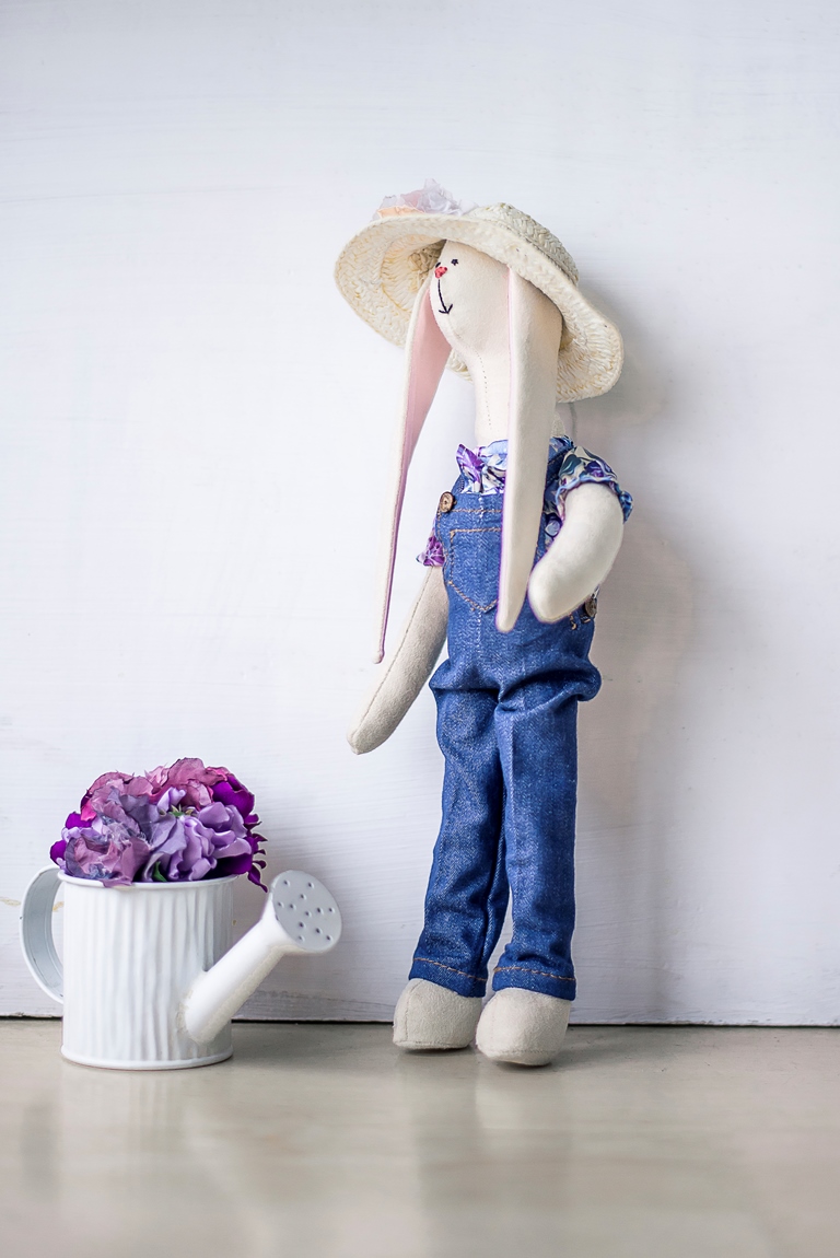 Зайка сшита из замши очень приятной на ощуп.У нее шикарная цвестастая блузка,джинсовый комбинезон на пуговках.Имеет при себе прекрасную соломенную шляпу с содовыми цветами(из ткани),садовую лейку и не менее прекрасный букет цветов(из ткани,каждый цветок сделан отдельно и имеет свою веточку) из собственного сада.